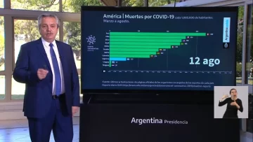 El presidente Alberto Fernández presentó hoy la situación del país en medio de la pandemia de coronavirus en 10 filminas en las que, en esta oportunidad, comparó datos como la tasa de incidencia acumulada y de mortalidad en América y en el país, así como la acumulación de casos confirmados y las camas ocupadas de terapia intensiva de adultos, todo hasta el 12 de agosto.
