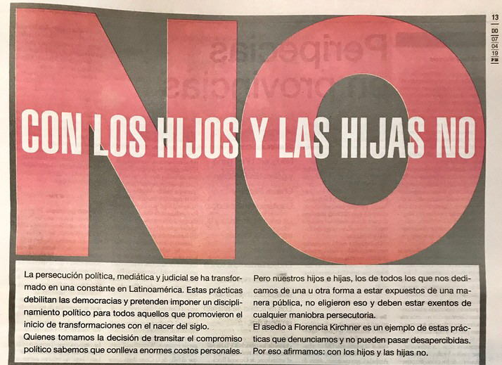 Bajo el título "Con los hijos y las hijas No", un puñado de expresidentes, diputados, legisladores y funcionarios de varios países de la región firmaron una solicitada para respaldar a Florencia Kirchner frente a lo que denominan "una persecución política, mediática y judicial".