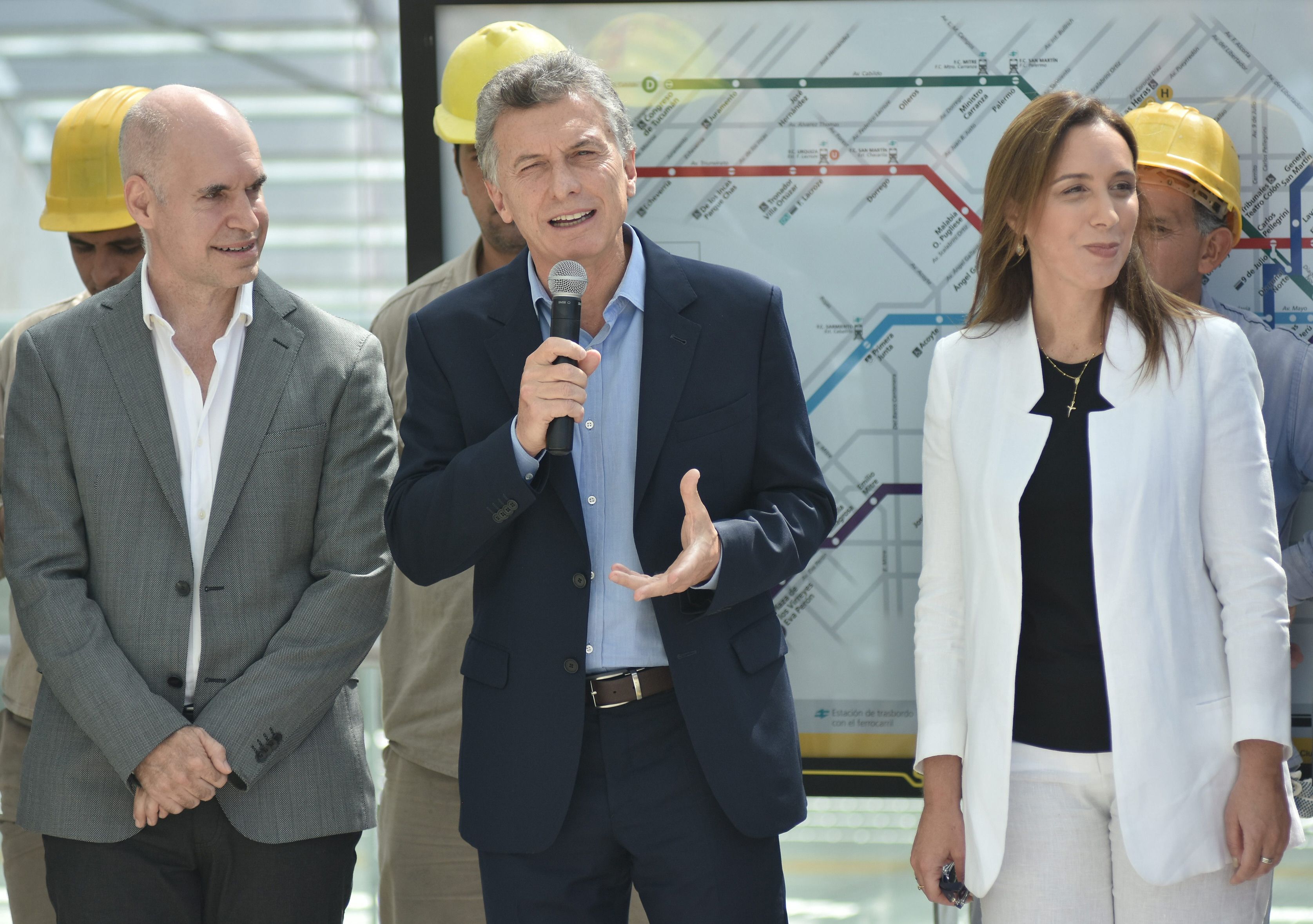 ‘Gobernadora, la quiero alentar. Sé que estamos en una discusión de fondo cuando decimos que queremos mejorar la calidad de la educación pública, es lo que hace que todos los chicos tengan las mismas oportunidades, por lo que queremos que este debate llegue hasta el final’, dijo Macri al encabezar el acto de inauguración del Centro de Transbordo Constitución en la ciudad de Buenos Aires. Además, el jefe de Estado exhortó a ‘no detenernos frente a aquellos que quieren que este cambio no avance’ y apuntó a que ‘tenemos que demostrarles nuestra convicción y desde esa convicción convencerlos’ porque ‘la batalla que estamos dando son las batallas por el futuro’.