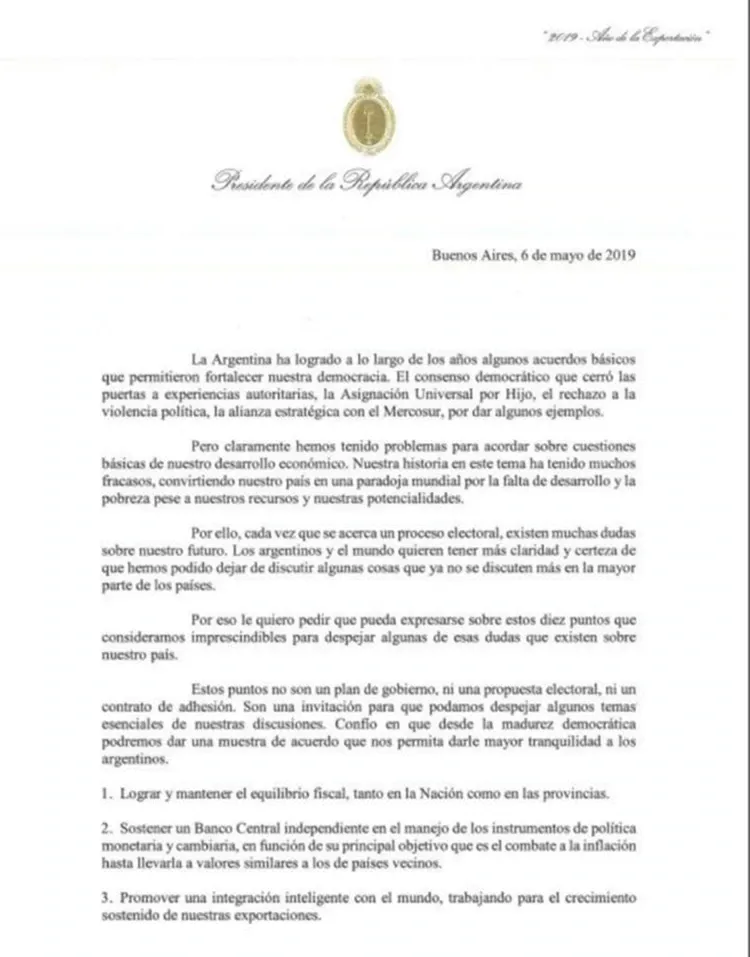 Fuentes oficiales confirmaron que a través de una carta firmada por el propio jefe de Estado se llamará al diálogo a Cristina Kirchner y a todos los precandidatos presidenciales. En esa lista se encuentran Juan Manuel Urtubey, Sergio Massa, Roberto Lavagna, Daniel Scioli y Miguel Ángel Pichetto.