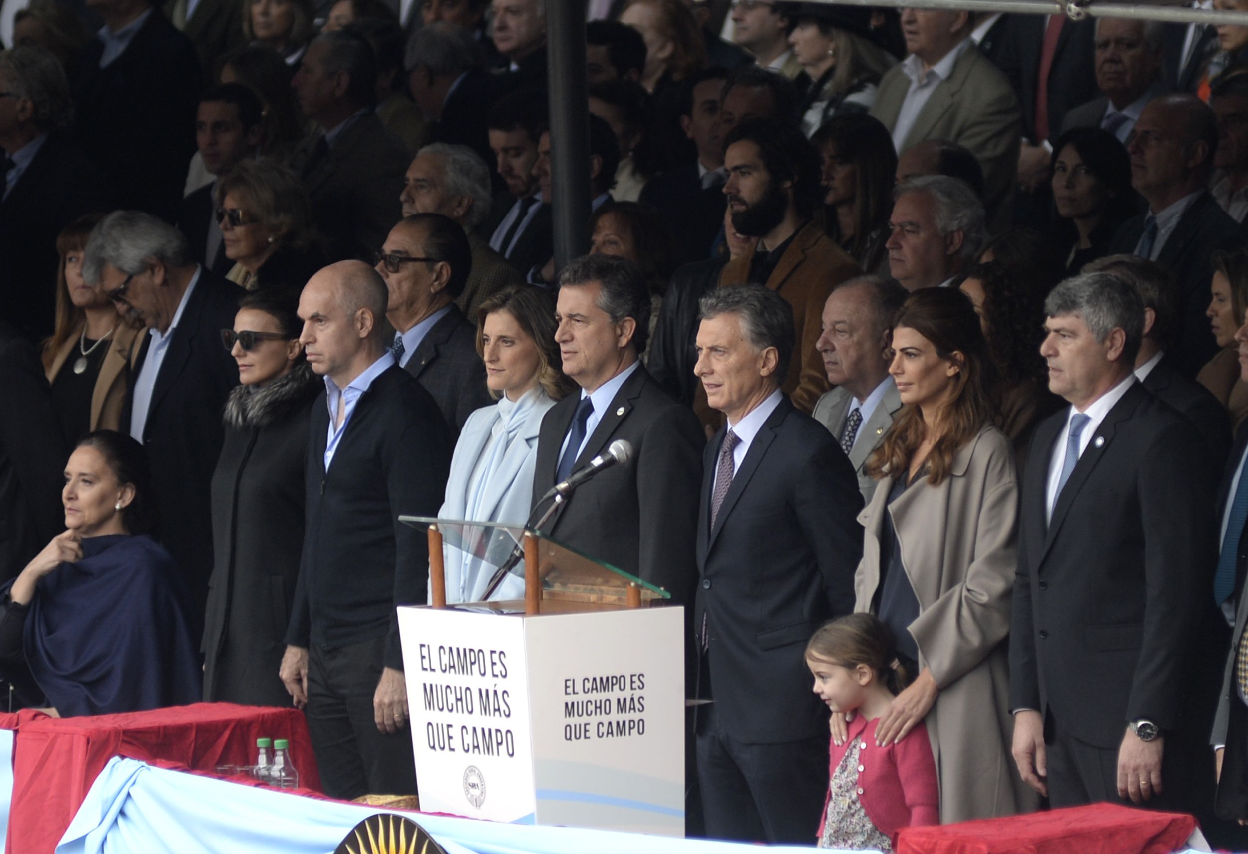 Acompañado por su esposa Juliana Awada; la gobernadora María Eugenia Vidal; el jefe de gobierno porteño, Horacio Rodríguez Larreta, y ministros de su gabinete, Macri mostró hoy la buena sintonía que viene teniendo con el sector, tras escuchar el discurso del titular de la Sociedad Rural Argentina, Luis Miguel Etchevere, quien elogió el combate del gobierno para bajar la inflación y disparó duras críticas contra la "actitud autoritaria" del kirchnerismo en contra del campo.