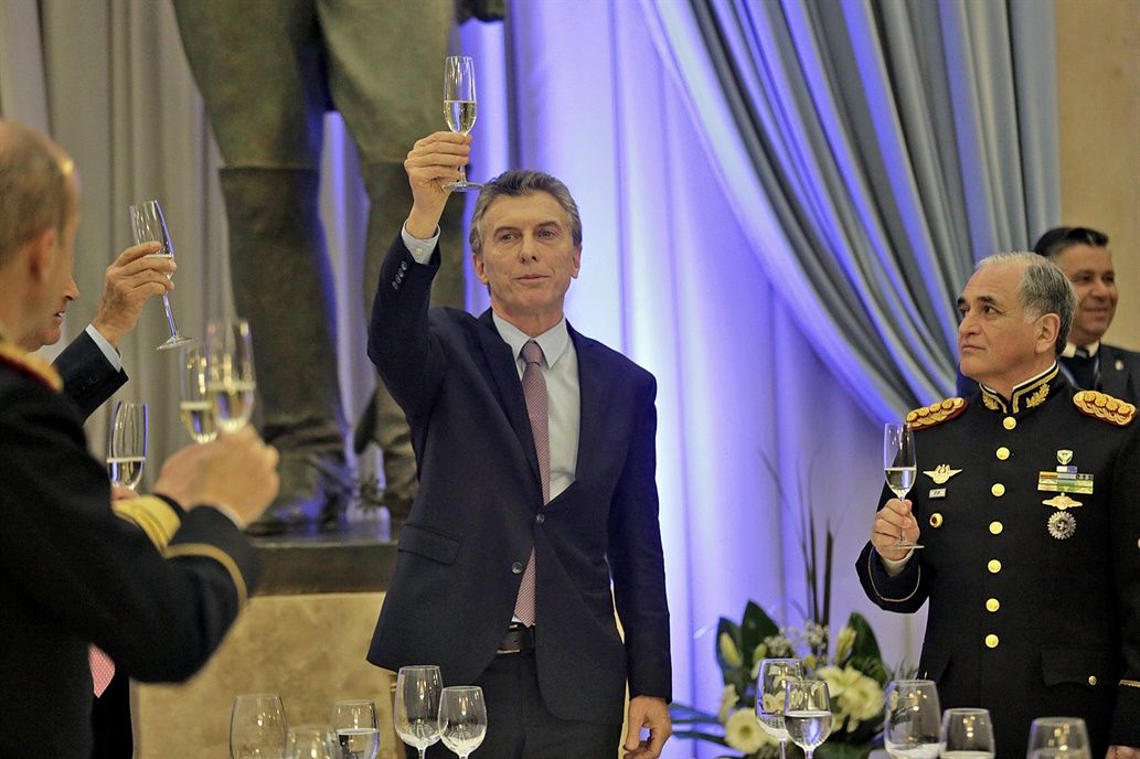 Levantaron sus copas, en la mesa principal, el ministro de Defensa, Oscar Aguad; el jefe del Estado Mayor Conjunto de las Fuerzas Armadas, teniente general Bari del Valle Sosa; los jefes del Ejército, general Claudio Pasqualini, de la Armada, vicealmirante José Luis Villán, y de la Fuerza Aérea, brigadier general Enrique Amrein; el jefe de Gabinete,Marcos Peña, y el presidente provisional del Senado, Federico Pinedo.