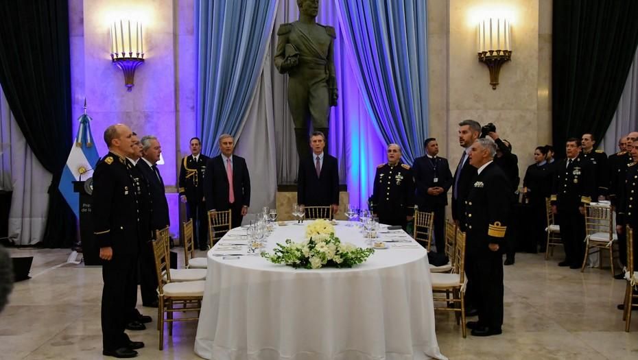 El presidente Mauricio Macri ratificó el "profundo compromiso de saldar la deuda histórica que tenemos con las Fuerzas Armadas de la democracia" y la decisión de avanzar en la reforma militar anunciada la semana pasada en Campo de Mayo. Lo afirmó al encabezar esta noche la comida anual de camaradería con las Fuerzas Armadas, en el salón de honor del edificio Libertador, ante las principales autoridades militares.