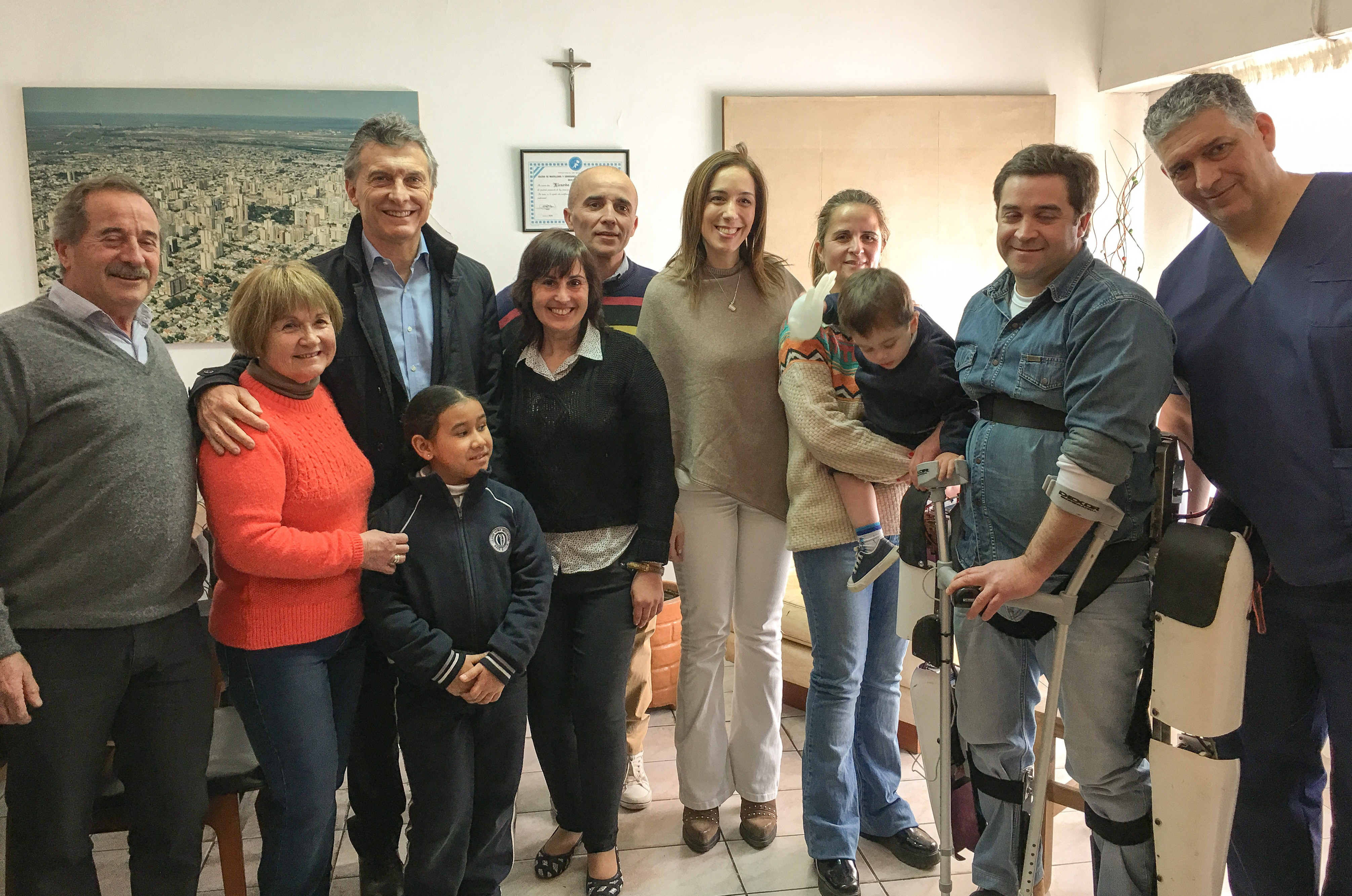 Con ingenieros. Macri visitó en Bahía Blanca a los creadores de Dexor Biomecánica, dos ingenieros que destinaron ahorros al desarrollo de un exoesqueleto que ayuda a personas con discapacidad a lograr una mayor autonomía.