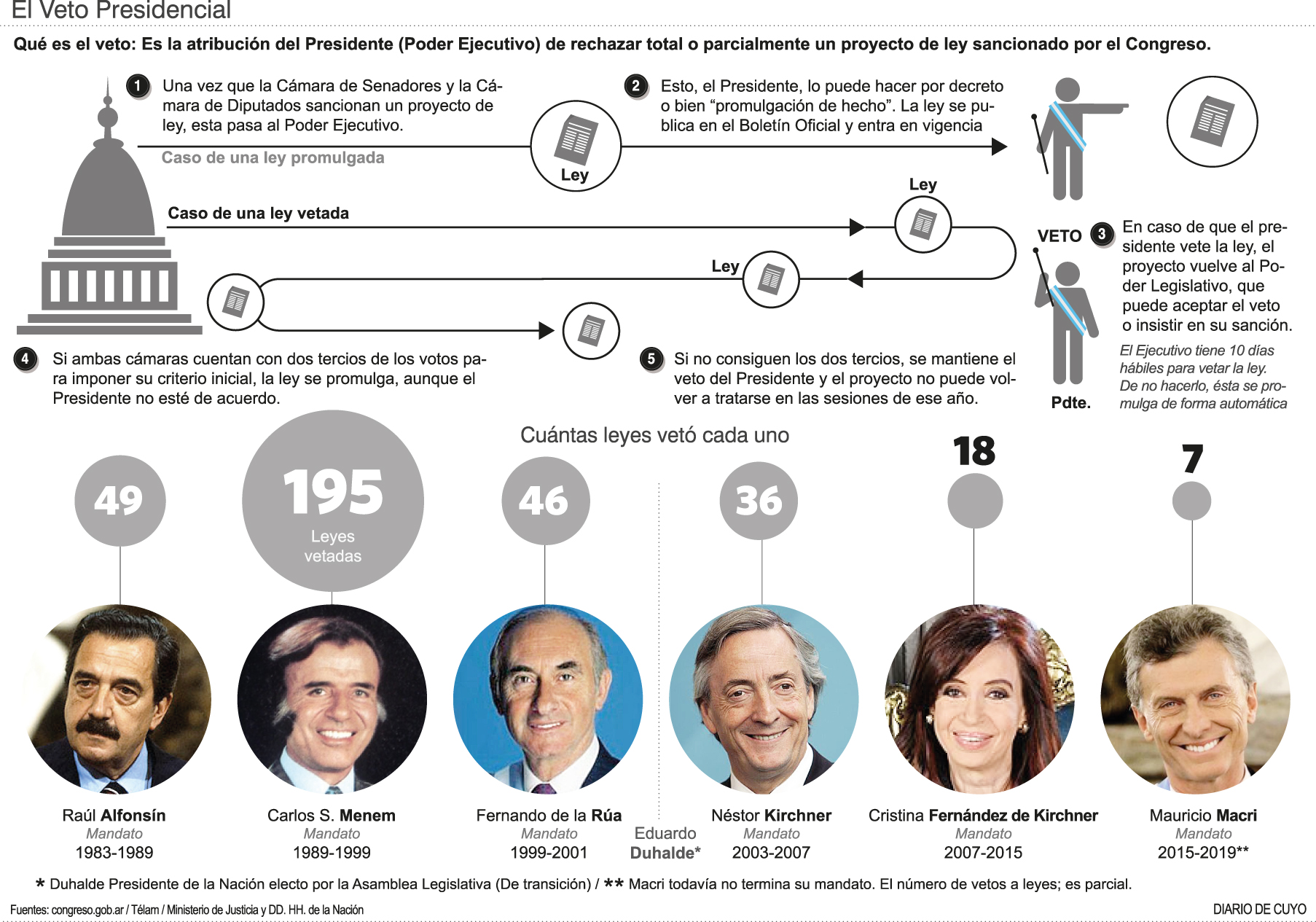Vale la pena destacar que Cambiemos no cuenta con mayoría en ninguna de las Cámaras, mientras que durante ambos mandatos de la ex presidenta -salvo en 2009- el kirchnerismo tuvo mayoría oficialista en el Congreso.