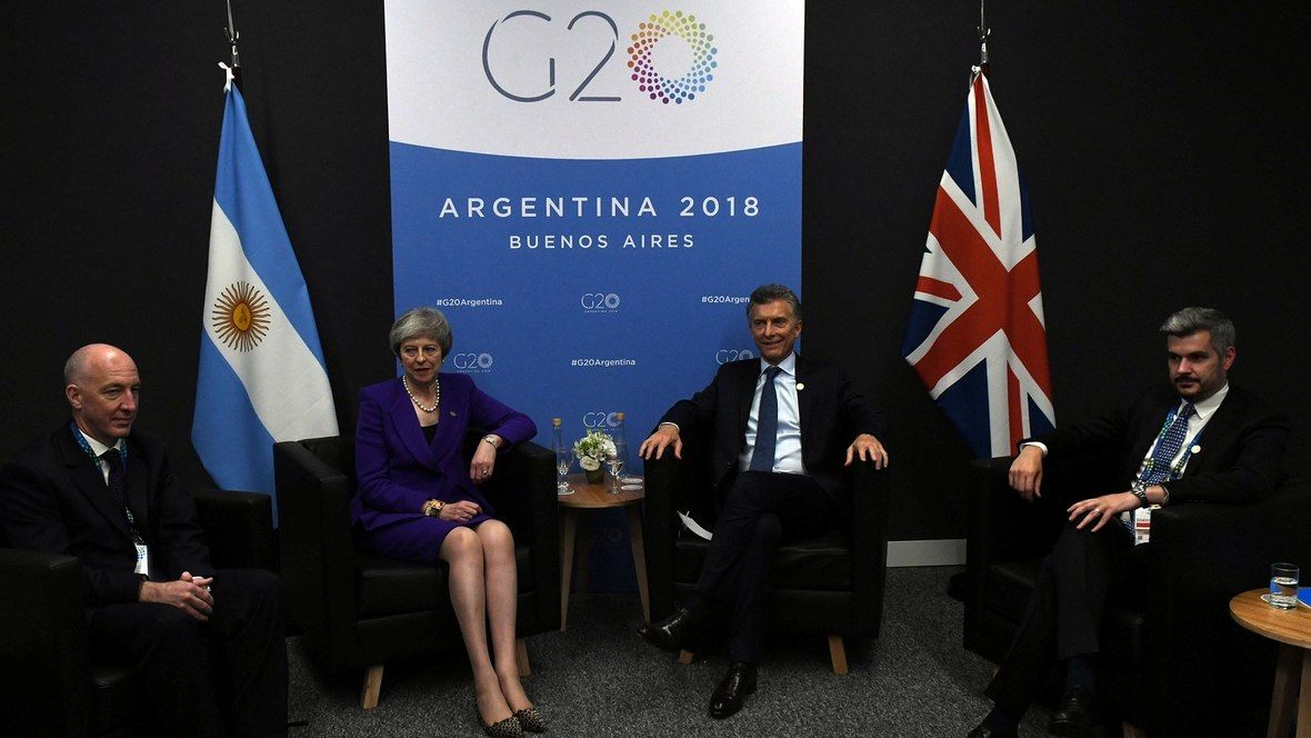 Terminó la reunión entre Mauricio Macri y Theresa May, un encuentro que no puede ser calificado de "bilateral" y que sólo duró 15 minutos, pero que fue calificado como altamente positivo por miembros de ambas delegaciones. Macri expresó que estaba "muy contento de recibirla" en Buenos Aires y May que, a partir del Brexit, quiere "empezar a hablar en forma independiente con el Mercosur", es decir, ahora que ya no forma parte de la Unión Europea.