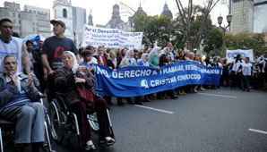 Integrantes de agrupaciones como La Cámpora, Juventud Peronista, La Néstor Kirchner y otras organizaciones políticas comenzaron a marchar desde las 17 alrededor de la Plaza, encolumnados detrás de las Madres y de Hebe de Bonafini, empuñando banderas y entonando canciones referidas a la consigna ‘Por el derecho a trabajar. Resistir sin descansar.