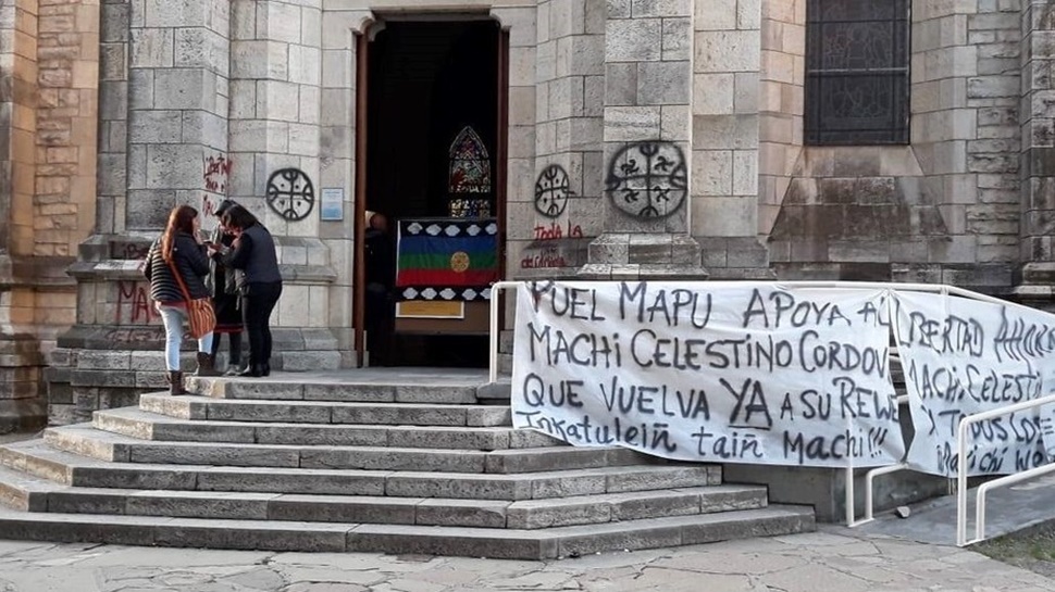 Cerca de las 18.30 un grupo de mujeres y chicos mapuches ingresó a la Catedral mientras varios fieles se encontraban rezando y tocaron instrumentos musicales como forma de protesta. Además, en el exterior del edificio, colocaron una bandera y realizaron pintadas con símbolos mapuches y consignas exigiendo la liberación del líder espiritual.