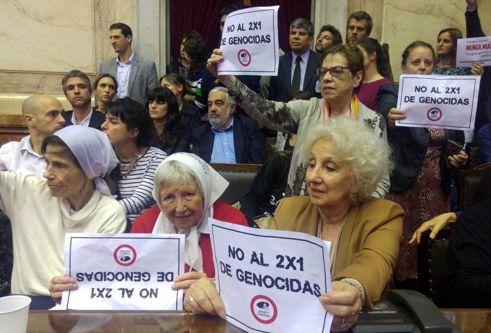 Desde el escenario, que estará emplazado frente a la Casa Rosada, las Madres darán aviso sobre ‘el momento preciso en el que todos los presentes se coloquen los pañuelos en la cabeza como señal de repudio al 2×1‘. ‘No perdonamos, no nos reconciliamos. Cárcel común y perpetua a los genocidas‘, exigió el organismo de Derechos Humanos a la vez que solicitó el acompañamiento de la sociedad ‘para que nunca más haya impunidad en la Argentina, porque lo que no se juzga y condena, se repite‘.