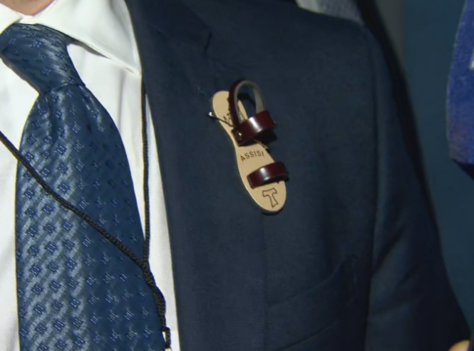 Una vez que arribó a la Universidad Nacional del Litoral, Marco Lavagna dialogó con Daniel Malnatti sobre el inesperado prendedor. "Es un apoyo por cómo empezó todo este camino. Tanto ruido que hicieron, merecían un apoyo moral las sandalias", explicó el hijo del candidato a presidente.
