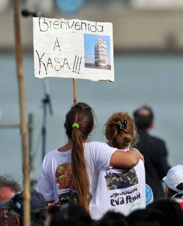 En tanto, en los alrededores, unas 500 mil personas siguieron el arribo de la Fragata durante su trayectoria hacia la base nava, informaron fuentes de la organización.