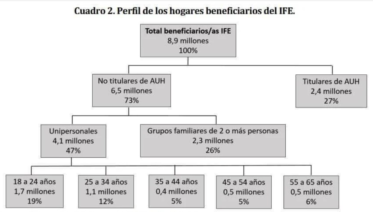 La mayor parte de las personas que cobran el ingreso de emergencia son trabajadores informales o desocupados. Este sector corresponde a seis de cada diez IFE pagados por Anses. Otro 27% son beneficiarios de AUH y AUE, 700.000 son monotributistas, 180.000 empleados de casas particulares y 120.000 titulares del plan Progresar.