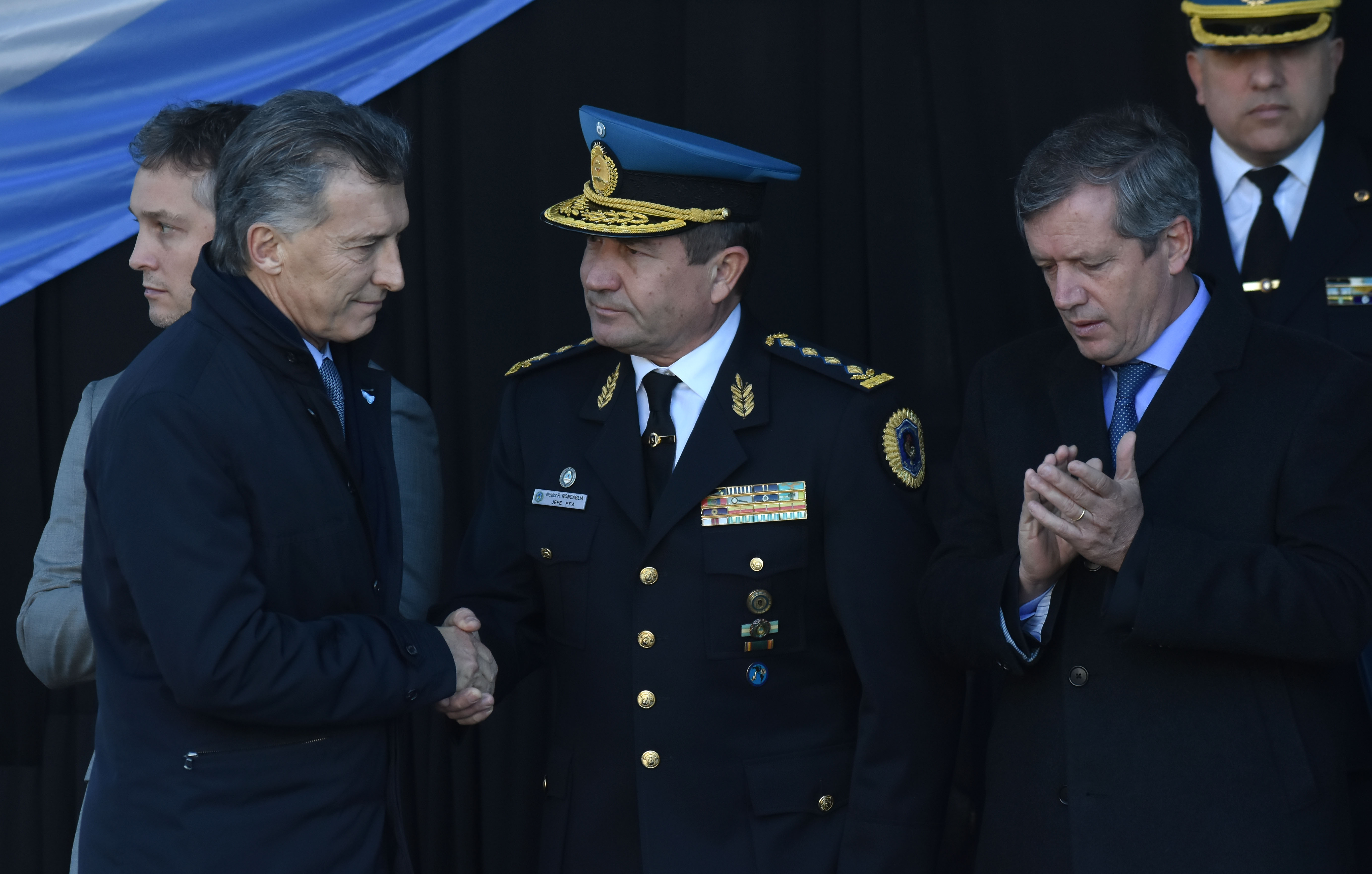 Lo acompañaron en el acto de homenaje a los policías la ministra de Seguridad, Patricia Bullrich; el secretario de Seguridad, Eugenio Burzaco; el secretario general de la Presidencia, Fernando De Andreis; el titular de la Cámara de Diputados, Emilio Monzó; el jefe de la Policía Federal, comisario general Néstor Roncaglia, y miembros de la plana mayor de esa fuerza, junto a familiares de los doce policías caídos.