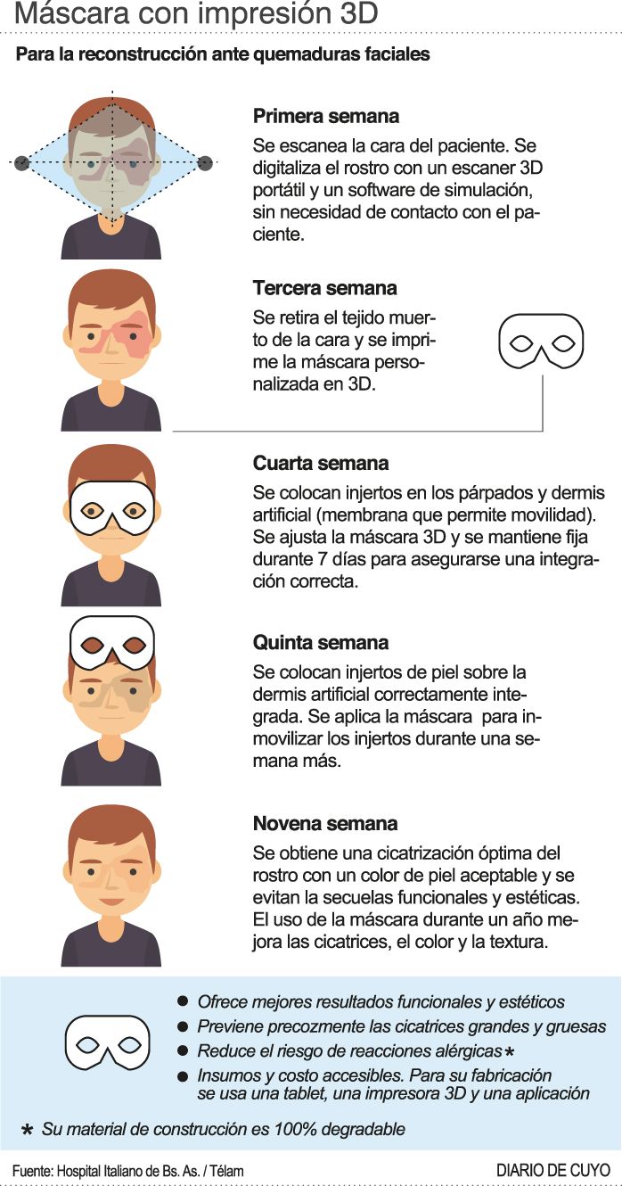 Una máscara 3D que reproduce las características del rostro y mejora los resultados de la reconstrucción facial en casos de quemaduras profundas fue creada "por primera vez en el mundo" por cirujanos plásticos del Hospital Italiano de Buenos Aires, informó ayer ese centro de salud.