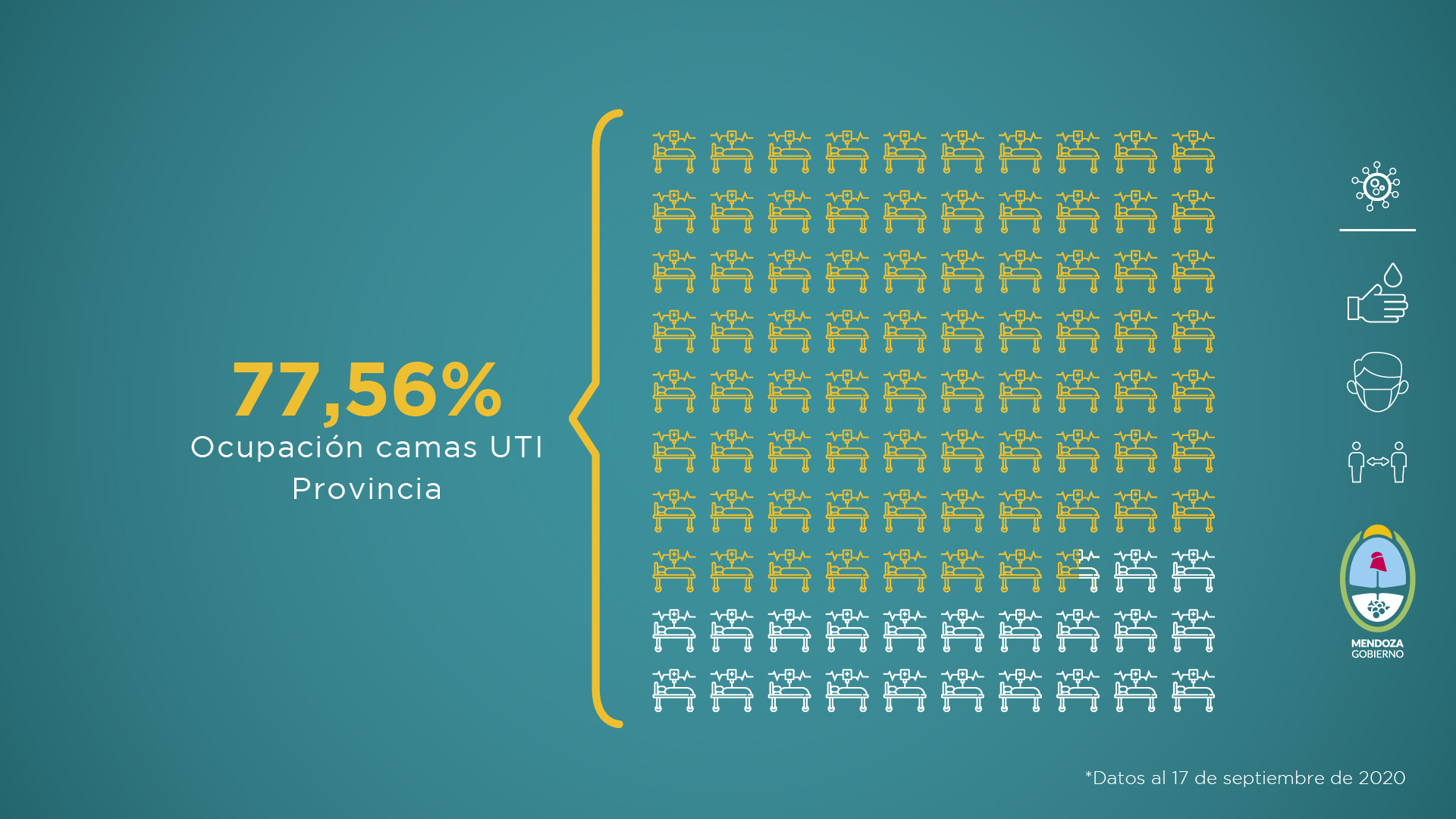 Así, en el periodo que va del 11 al 17 de septiembre de 2020, en el Gran Mendoza la cifra es de 88,68% de ocupación, alrededor de un 6% más que la semana anterior. En todo el territorio provincial el total de camas ocupadas es de 77,56%.