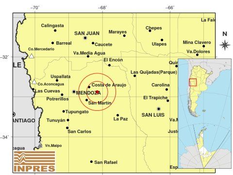 El epicentro fue 64 km al E de Mendoza, 156 km al S de San Juan, 26 km al SE de Costa De Araujo.  -32.881 (lat) -68.156 (long). Tuvo una profundidad de 7 kilómetros.