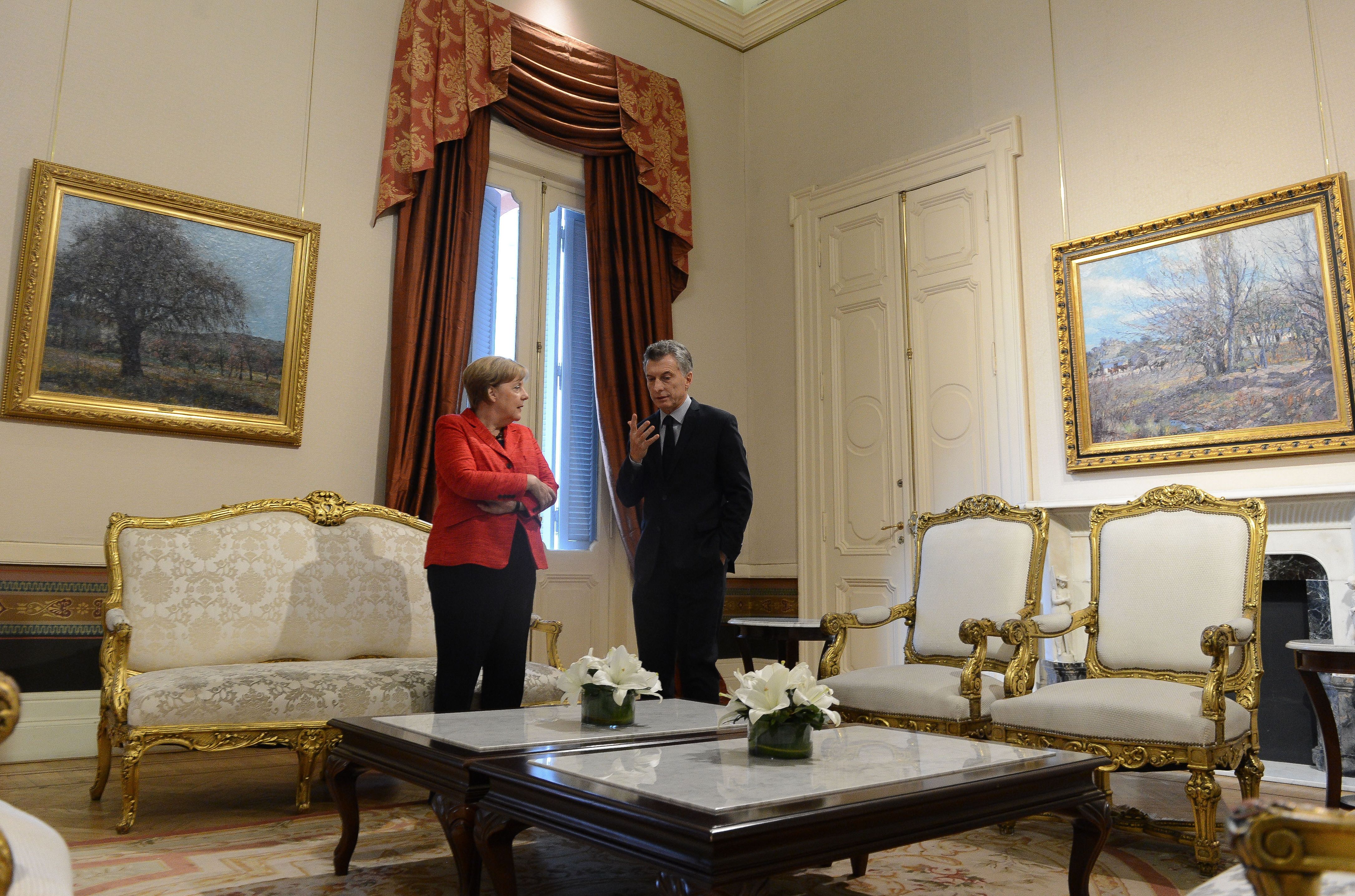 Macri recibió a Merkel minutos antes del mediodía en la explanada de la Casa Rosada, mantuvo una reunión bilateral de más de una hora, compartió un almuerzo en uno de los salones de la sede gubernamental y luego una reunión con una decena de empresarios alemanes. Por la tarde-noche asistieron a una cena de gala en el centro Cultural Kirchner.