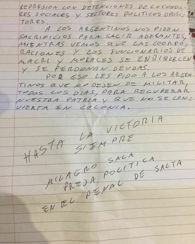 Desde el Penal Federal de Güemes, en la provincia de Salta, donde Milagro Sala cumple su cuarto día de detención ilegal, la dirigente social envió una carta de su propio puño y letra.