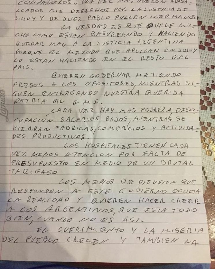 "Compañeros, una vez más fueron avasallados mis derechos por la Justicia de Jujuy y del juez Pablo Pullen Llermanos".