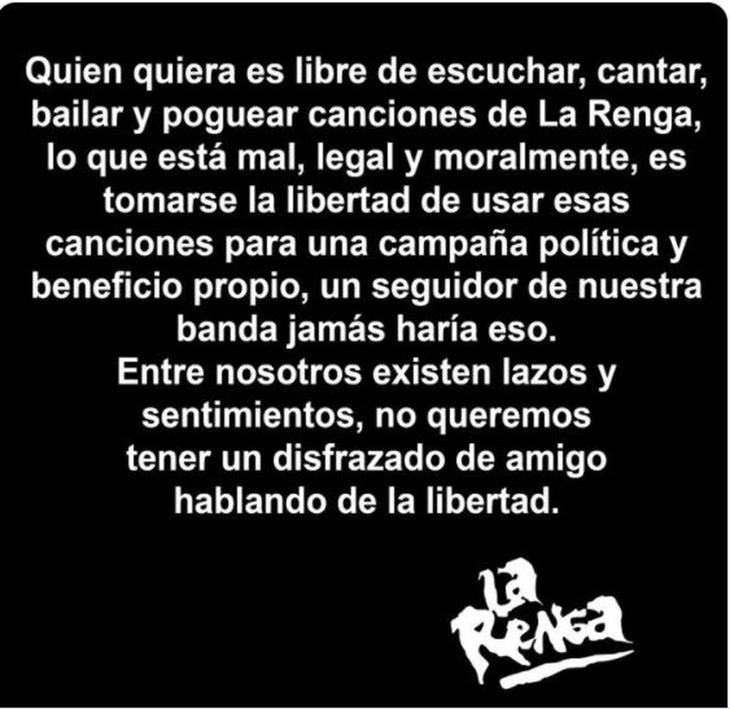Luego, la banda mostró su descontento con el precandidato y el lunes difundió un comunicado en el que expresó: “Quien quiera es libre de escuchar, cantar, bailar y poguear canciones de La Renga, lo que está mal, legal y moralmente, es tomarse la libertad de usar esas canciones para una campaña política y beneficio propio, un seguidor de nuestra banda jamás haría eso”.