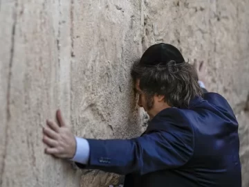 En su primera actividad oficial en Israel, el presidente Javier Milei visitó hoy el Muro de los Lamentos, lugar sagrado para el judaísmo, donde fue recibido por el rabino Shmuel Rabinowitz.