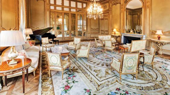 Desde todos los salones principales, que están agrupados alrededor del gran espacio de la escalera, se ven los distintos espacios verdes. Las paredes están recubiertas por boiseries que combinan estilos del siglo XVIII francés y que repiten algunos motivos de los exteriores del edificio y de los espacios circulatorios.