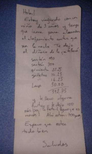 La nota decía: ‘Hola, estoy viajando con un niño de 3 años y tengo que irme para alcanzar el alojamiento antes que se haga la noche. Te dejo dinero de lo que llevé y te llevo algunas frutas. Te dejo 100 más por la fruta, supongo que es menos, ahí están 700 pesos. Espero que esté todo bien. Saludos’.