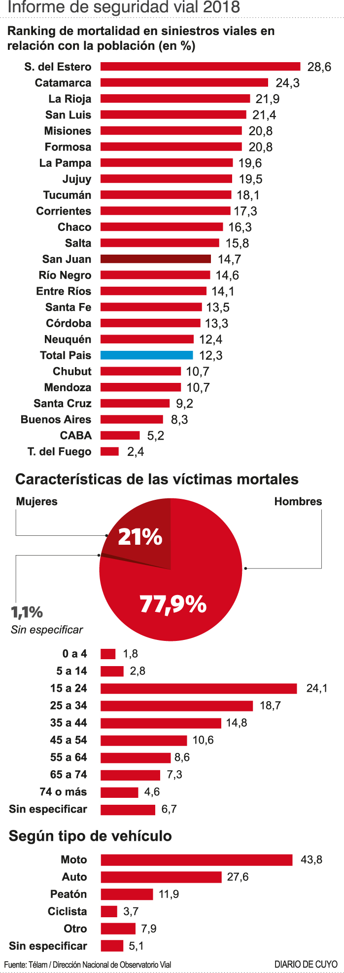 Las provincias del norte del país encabezaron en 2018 el ranking de mortalidad en siniestros viales en relación a su población, con Santiago del Estero a la cabeza con un 28,6%; mientras Tierra del Fuego cerró la nómina, con 2,4% de fallecidos del total de sus habitantes, según el Observatorio Vial de la ANSV.