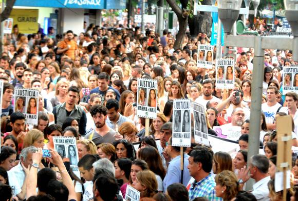 La concentración que reunió a miles de manifestantes, en su mayoría jóvenes, se realizó a las 19 en la calles Catamarca y San Juan, frente a la sede central de la Universidad del Aconcagua, a la que asistía una de las chicas asesinada. Allí bajo el lema ‘Justicia por Marina y Majo’ y con velas encendidas en sus manos y pancartas que rezaban ‘Ni una menos’ y ‘Verdad y Justicia’, entre otras, los manifestantes recorrieron las principales calles del microcentro mendocino, aplaudidos por los transeúntes y acompañados por las bocinas de los coches.
