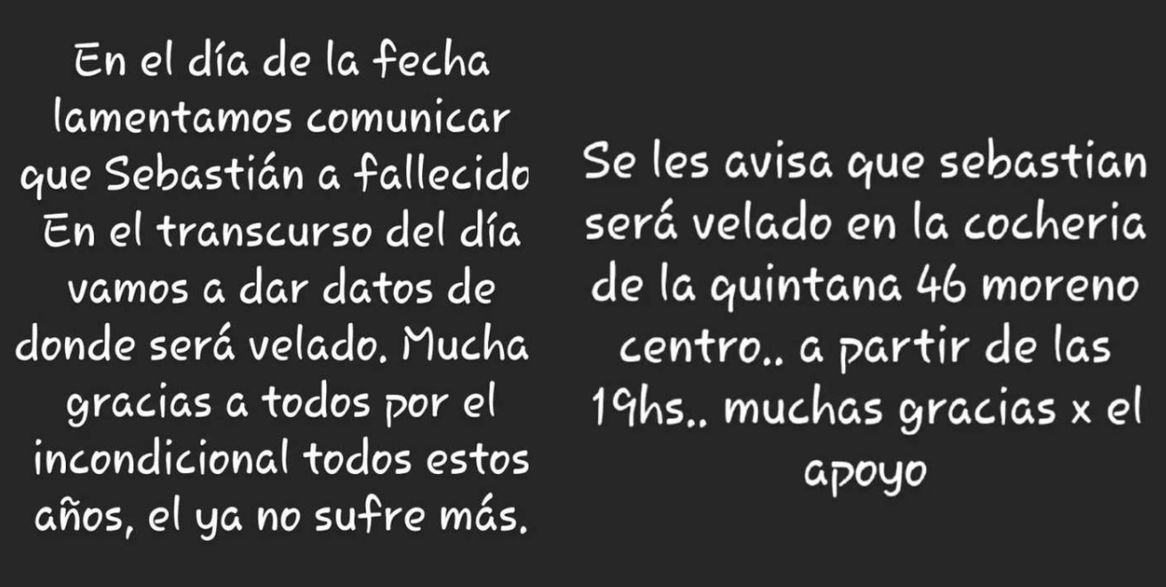“En el día de la fecha lamentamos comunicar que Sebastián ha fallecido. En el transcurso del día vamos a dar datos de dónde será velado. Muchas gracias a todos por el incondicional apoyo todos estos años, él ya no sufre más”, escribieron familiares de Amurín desde la cuenta de Instagram del joven.