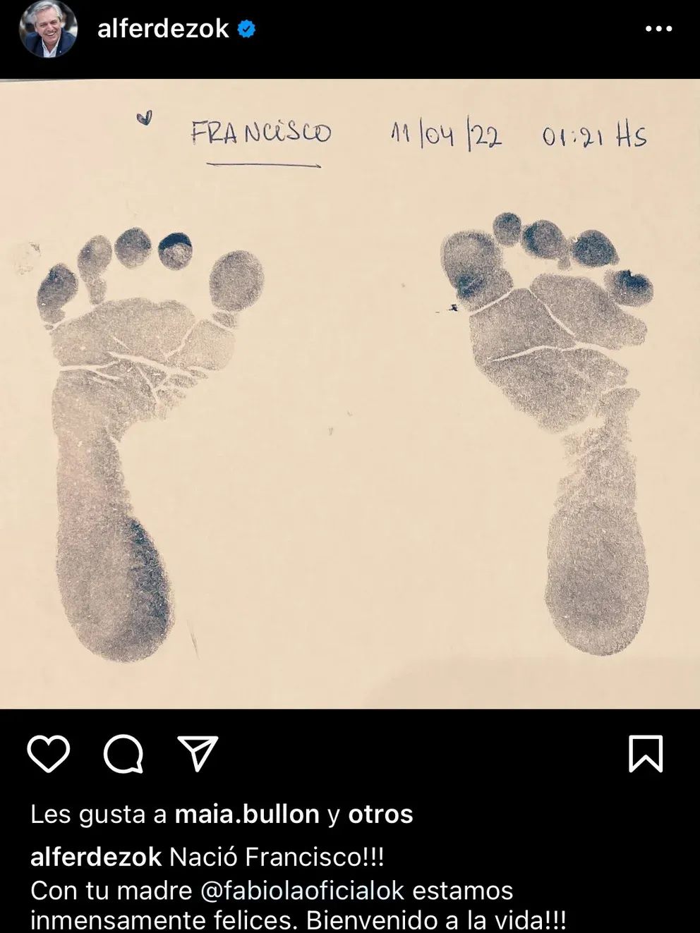 “¡¡¡Nació Francisco!!! Con tu madre, Fabiola Yañez, estamos inmensamente felices. ¡¡¡Bienvenido a la vida!!!”, escribió el jefe de estado en la red social, donde compartió una foto con las huellas de los pies de su pequeño hijo, su nombre y la fecha y hora de su nacimiento.