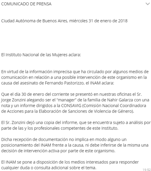 Tras las declaraciones de Tuñez, el INAM difundió un comunicado que ratificó los dichos de su presidente y que destaca que ayer “se presentó en nuestras oficinas el Sr. Jorge Zonzini alegando ser el ‘manager’ de la familia de Nahir Galarza con una nota y un informe dirigidos a la CONSAVIG (Comisión Nacional Coordinadora de Acciones para la Elaboración de Sanciones de Violencia de Género). En Sr. Zonzini dejó una copia del informe, que se encuentra sujeto a análisis por parte de las y los profesionales competentes de este instituto”.