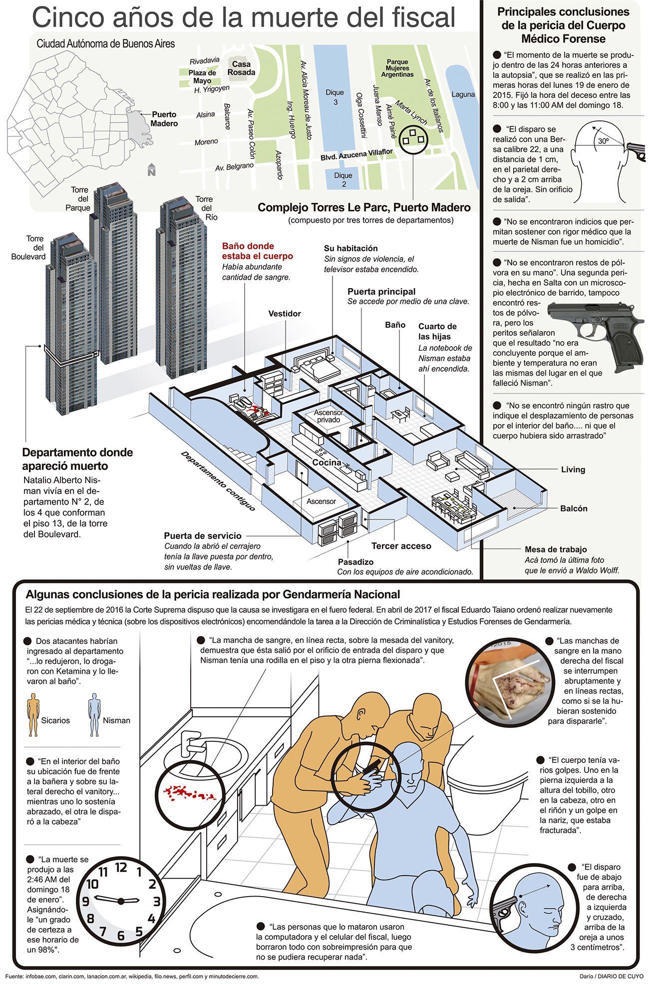 Una denuncia, un arma, una foto. El caso de la muerte de Alberto Nisman tiene infinitos detalles, decenas de personajes y, cuando se cumple un lustro del suceso, aún toda la incertidumbre sobre lo que pasó en el baño donde se encontró el cadáver. Y la Justicia sigue sin identificar al autor del supuesto homicidio del fiscal de la causa AMIA y que se disponía a presentar una denuncia de alto impacto político contra la expresidenta Cristina Fernández de Kirchner por el supuesto encubrimiento de los iraníes sindicados con los autores intelectuales y materiales del peor atentado terrorista en la historia de Argentina, que dejó 85 muertos.