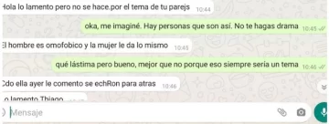 “Sé lo que significa ser trans y lo que conlleva. Por eso le dije a Thiago que por favor le preguntara a esta intermediaria si tenía problema con eso”, contó, y remarcó: “Yo sé que ser trans no es mi carta de presentación, pero sé que mucha gente detesta el hecho de que yo sea trans y niega mi existencia. Ya he pasado muy feos momentos en entrevistas de trabajo, en bares, así que para evitar eso, prefiero mandarme al frente y si no le gusta me evito un mal momento”.