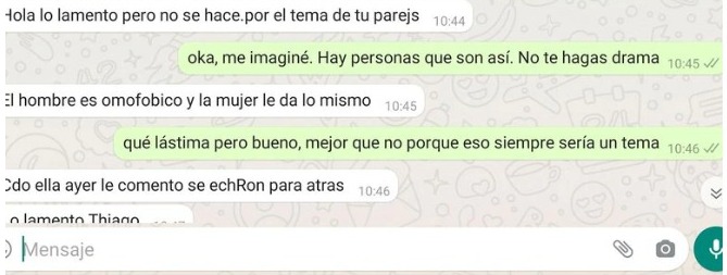 “Lo lamento, pero no se hace por el tema de tu pareja”, dijo la intermediaria, y agregó: “El hombre es homofóbico y a la mujer le da lo mismo; cuando ella le comentó, se echaron para atrás”.