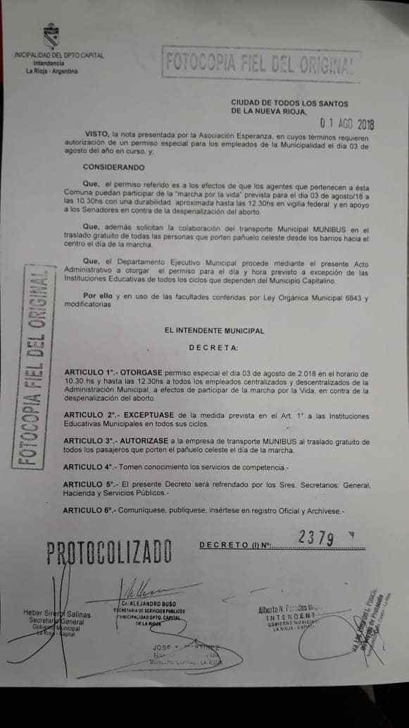 El debate por el aborto sigue abriendo grietas en la sociedad argentina. La provincia de La Rioja atraviesa una enorme polémica luego de que se conociera que el intendente de la capital provincial diera asueto por decreto a los empleados municipales que quieran asistir a la marcha antiaborto.