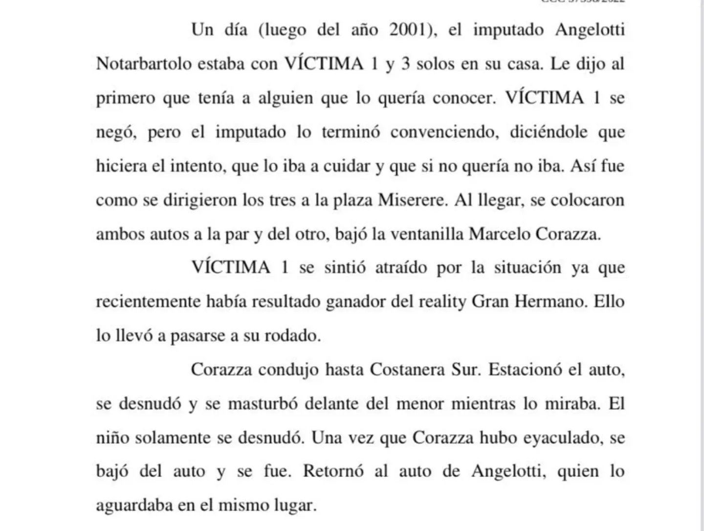 De acuerdo a la denuncia, avalada por el procesamiento actual, Corazza le habría mostrado los genitales a un menor dentro de un auto, cerca de la plaza Miserere. En uno de los vehículos viajaba el supuesto líder de la banda. Tanto Angelotti como Mermet se negaron a declarar, en una primera instancia, al igual que el mediático.