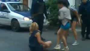 En un momento de la discusión, uno de los policías le da una trompada a la joven, dejándola tirada en el piso.
