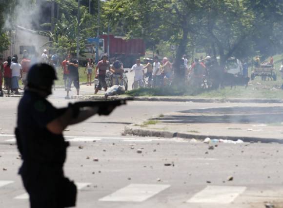 Cientos de vecinos fueron dispersados ayer por la mañana con balas de goma y gases lacrimógenos por la Guardia de Infantería y Gendarmería en el cruce de Panamericana ramal Tigre y ruta 202, luego de intentar saquear un supermercado Carrefour en San Fernando. El conflicto se intensificó pasado el mediodía, cuando el grupo logró ingresar al predio comercial y se enfrentó con la policía arrojando piedras y usando tablas de maderas como escudos. Los manifestantes destrozaron también una estación de servicio cercana y atacaron un camión de una cooperativa de cartoneros, cuyo chofer resultó herido en un ojo.