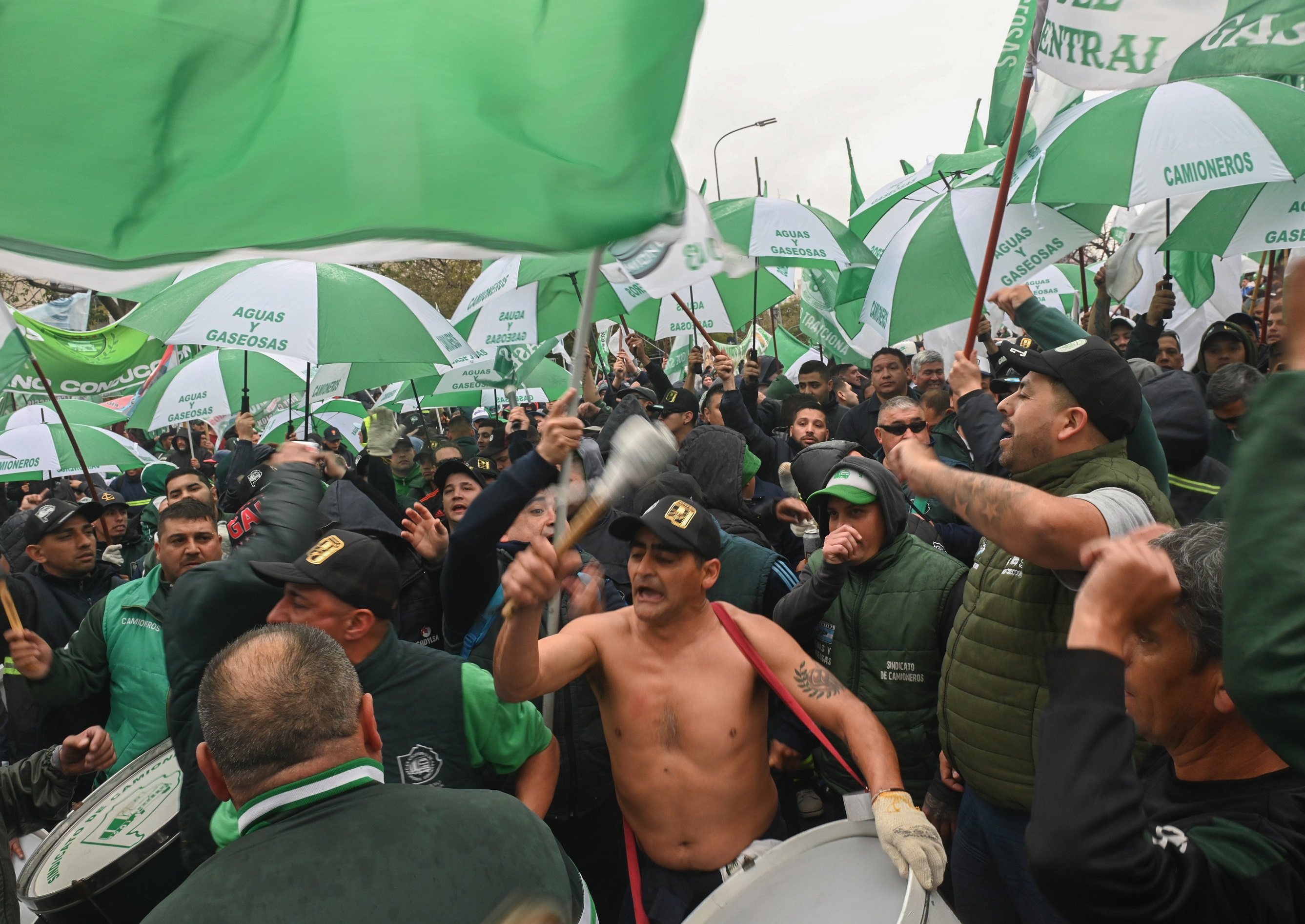 En tanto, en la intersección de las avenidas 9 de Julio y Belgrano, columnas de los gremios de Camioneros, Smata, Textiles, Petroleros, UTA, Taxistas y Navales se manifestaban con bombos, banderas, pasacalles y globos aerostáticos.