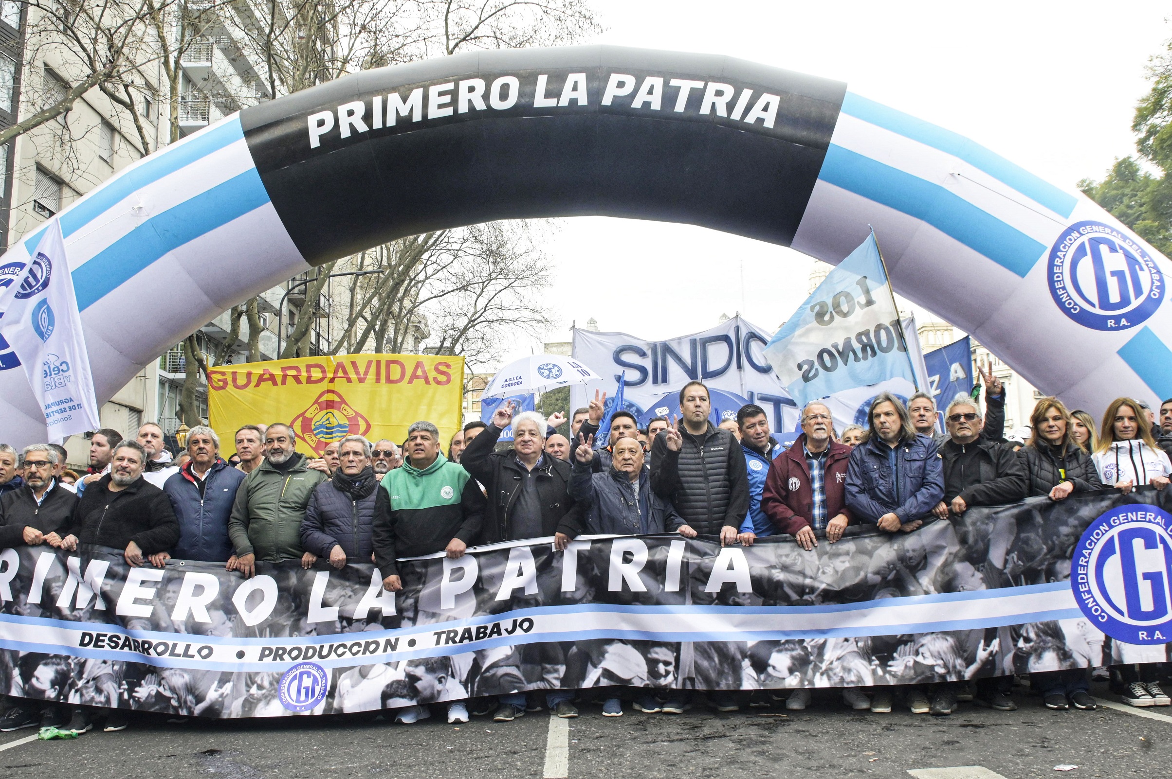 Las columnas de manifestantes habían salido a las 14.30 desde la intersección de 9 de Julio y Avenida de Mayo con una bandera que atravesaba la calle con el lema "Primero la Patria", sostenida por los cosecretarios generales de la CGT Héctor Daer, Carlos Acuña y Pablo Moyano y otros dirigentes como Omar Plaini y Sergio Romero, entre otros.