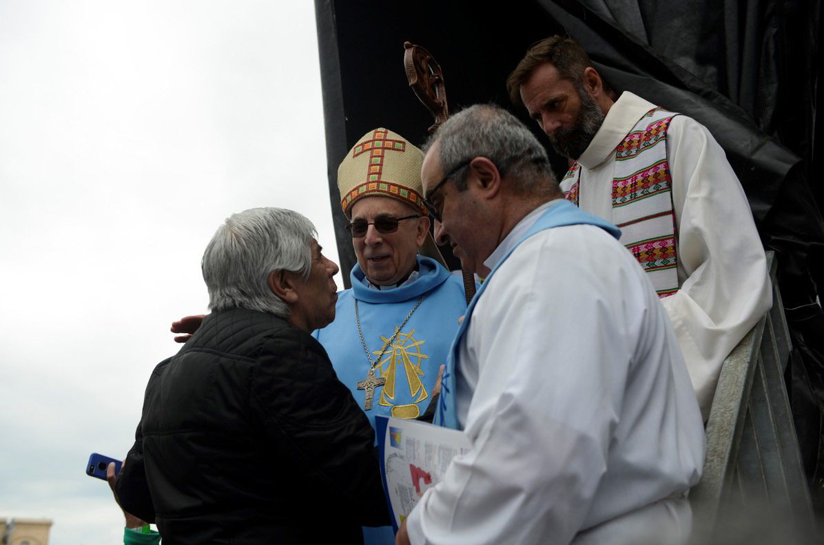 A Dios rogando. El arzobispo de Mercedes-Luján, Agustín Radrizzani, bendice al líder camionero Hugo Moyano en el epílogo de la misa de gremios opositores contra el Gobierno de Mauricio Macri en la histórica Basílica.
