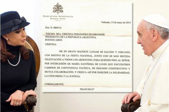 Es una carta firmada por el papa Francisco dirigida a la presidenta Cristina Fernández donde el Sumo Pontífice felicitaba a los argentinos con motivo de la proximidad del Día de la Patria, domingo 25 de Mayo. En ella, el Sumo Pontífice mandaba un inequívoco mensaje de paz al pedir ’convivencia pacífica’ y un ’diálogo constructivo’. Nada más apropiado para la ocasión teniendo en cuenta la reciente polémica entre el Gobierno y la Iglesia por el documento del Episcopado en el que los obispos denunciaron que ’Argentina está enferma de violencia’.