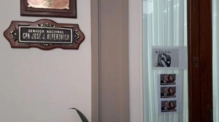 Este martes, la puerta del despacho de Alperovich en la Cámara Alta amaneció con carteles del colectivo Ni Una Menos y fotos de la fórmula ganadora de las elecciones: Alberto Fernández-Cristina Kirchner.