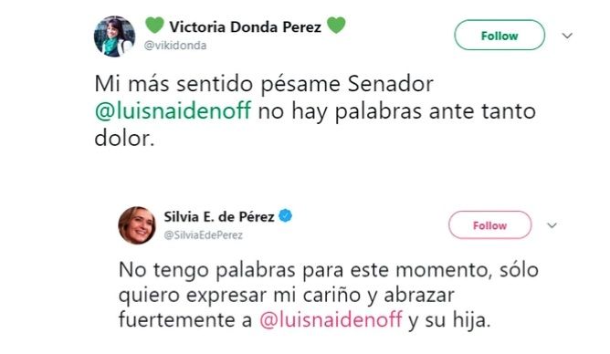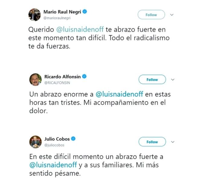 Mientras que, la vicepresidenta Gabriela Michetti expresó su "cariño y acompañamiento" a la familia del formoseño. "Fuerte abrazo a Luis Naidenoff, en tan trágico momento, todo mi cariño y acompañamiento", escribió.