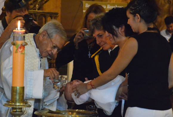 La beba, Umma Azul, quien llevaba un vestido ceremonial blanco, fue bautizada a las 10:30 por el sacerdote Carlos Varas, en lo que configuró el primer caso registrado en un templo católico de Argentina.