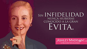 El sitio se llama Ashley Madison y recurrió a la figura de la segunda esposa del presidente Juan Domingo Perón para buscar más seguidores en la Argentina.