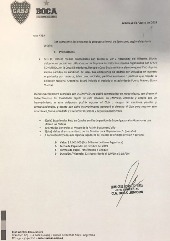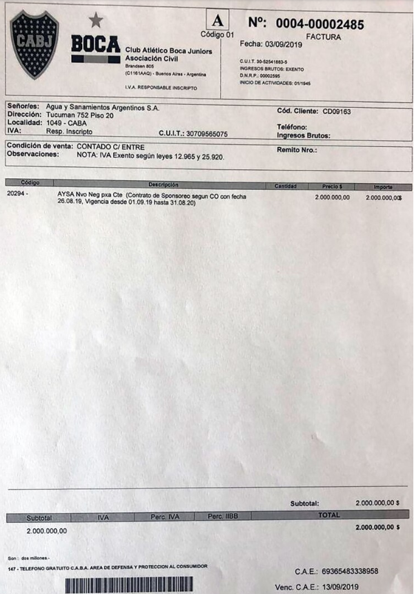 En la factura que Boca le hizo a Aysa, emitida el 3 de septiembre de 2019, aparece un monto de 2.000.000 millones de pesos en concepto de esponsoreo .