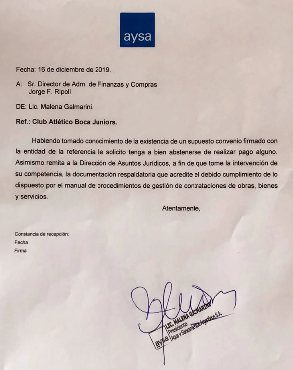 Este jueves el presidente de Boca, Jorge Ameal, dijo que el club investigará la situación contractual que involucra al club y a la empresa. “Hoy aparecieron cosas muy tristes, como que Aysa aportaba dinero, una cosa que no se puede entender, involucrando a periodistas, que tampoco es bueno, porque no le hace bien a Boca. Lo investigaremos”, indicó.
