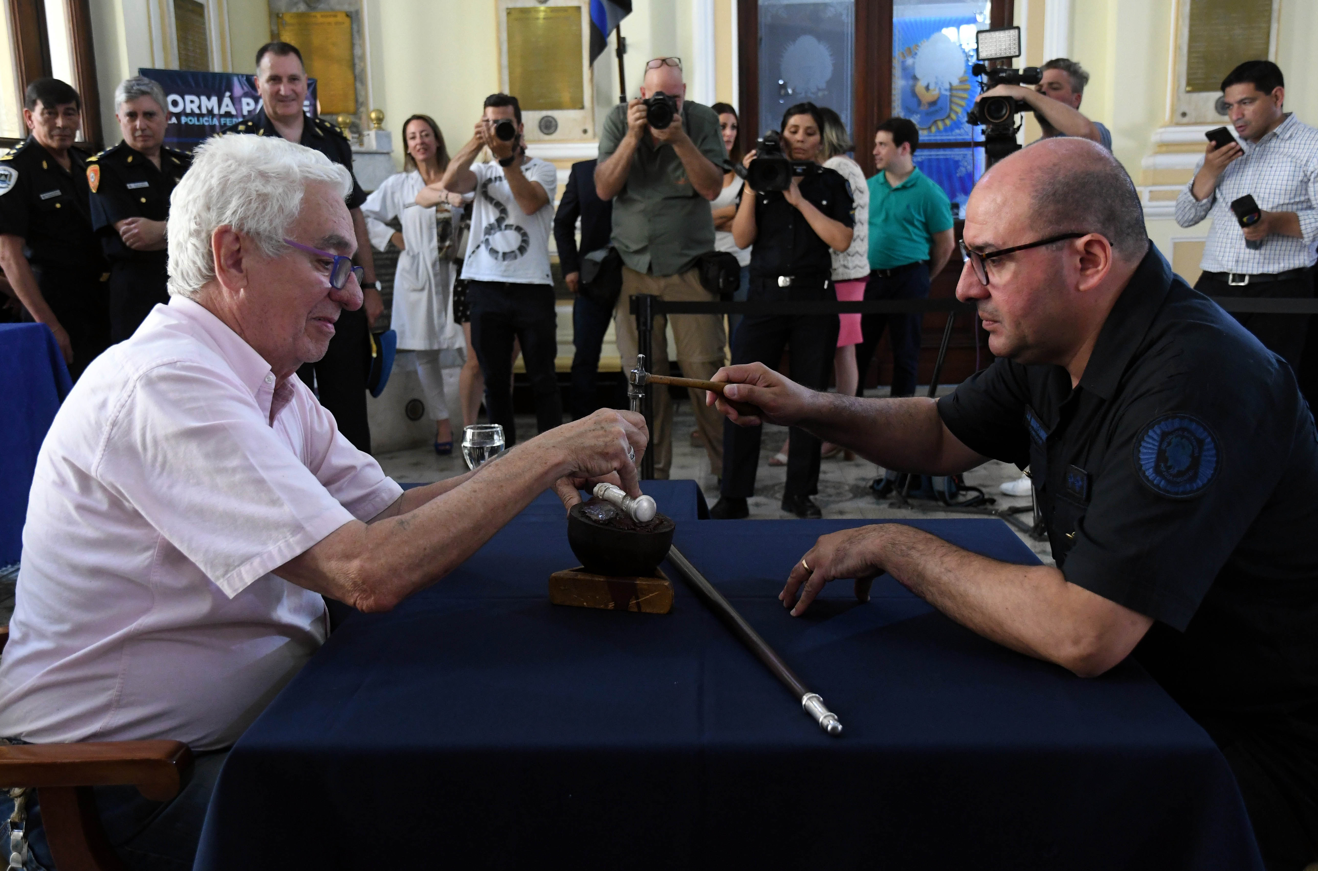 Durante el acto estuvo presente el jefe de la fuerza de seguridad, comisario general Néstor Roncaglia, y la subjefa, comisario general Mabel Franco. Por su parte el comisario mayor, Jorge Sanssone, director del área de Medios y Planificación, explicó al personal policial -congregado en el Patio de las Palmeras del Departamento Central- la relevancia del acto y los invitaba al simbólico gesto de dejar su "marca" en el bastón que será entregado el 10 de diciembre a Alberto Fernández, cuando asuma como presidente.